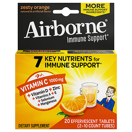 Airborne immune support effervescent tablets are packed with 1000mg Vitamin C per serving, which helps support your immune system.* These Vitamin C with Zinc effervescent tablets contain 73% of your daily value of Zinc, which plays a central role in your immune system and is essential for the functioning and signaling of immune cells.* Airborne immune support tablets contains the powerful antioxidants Vitamin A, Vit C , Vitamin D (to support immune health) and Vitamin E (to help fight free radicals).* This crafted blend of 13 immune support vitamins, minerals & herbs is an excellent source of Zinc and Selenium.
