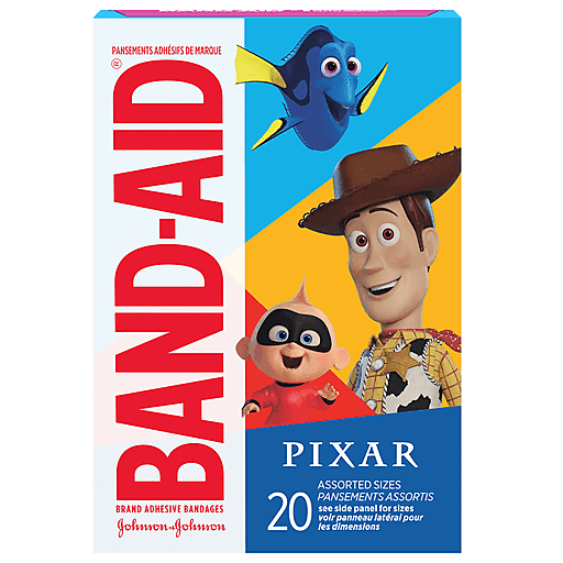 Care for your child's minor cuts and scrapes and bring a smile to their face with Disney/Pixar Mashup Band-Aid Brand Adhesive Bandages. These first aid adhesive bandages for kids and toddlers cover minor cuts and scrapes to deliver daily wound care and healing protection. Perfect for kids and toddlers, these fun bandages feature Disney/Pixar Mashup characters from Toy Story, Finding Nemo, The Incredibles and more to make first aid more fun for your child. As part of your essential first aid supplies, the decorated bandages protect minor wounds from contact with germs and dirt. These sterile kids' bandages come in various sizes and are comfortable to wear thanks to a non-stick pad that won't adhere to the wound. The box contains individually wrapped bandages in assorted sizes. For best results, apply bandage to clean, dry skin. Change daily, when wet, or more often if needed. Disney/Pixar