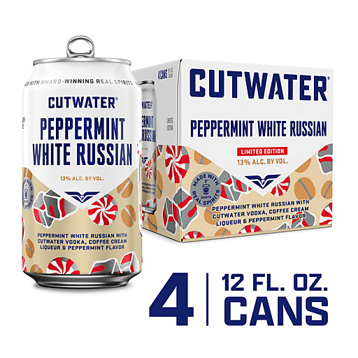 Cutwater Peppermint White Russian 4 Pack 12 fl oz Cans. Cutwater, real spirits, perfectly mixed. Featuring our award-winning Cutwater vodka, coffee cream liqueur and peppermint flavor. Enjoy with a peppermint garnish over ice or straight from our can. A seasonal indulgence, chill or drink on ice. Limited edition flavor available in select markets. Gluten free, made with real vodka.