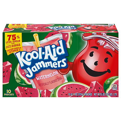 Kool-Aid Jammers Artificially Flavored Watermelon Drink Pouches deliver fun with a sweet blend of watermelon flavor. Our delicious kids drink contains 55% less sugar than leading regular sodas (per 12 fl oz, this product 10g total sugar, leading regular sodas 40g total sugar), making it a great artificially fruit flavored drink for kids. Packed in a convenient drink pouch, kids can enjoy Kool-Aid at home, on the beach or during lunchtime. Each box of artificially flavored watermelon Kool-Aid Jammers contains ten 6 fluid ounce drink pouches. Enjoy flavorful fun made easy. Available in a rainbow of flavors!