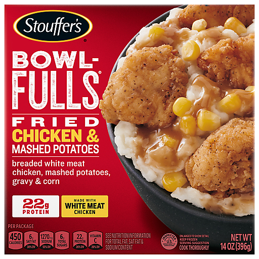 Stouffer's Bowl-Fulls Fried Chicken & Mashed Potatoes Frozen Meal offers a quick, easy solution for lunch or dinner. This Stouffer's frozen entree includes breaded white meat chicken, mashed potatoes, gravy and corn. This classic fried chicken dinner is sure to satisfy every taste bud. This single serving frozen fried chicken meal offers 22 grams of protein per serving. Stouffer's frozen meals are easy to prepare in the microwave, making this fried chicken a great choice for an easy dinner when you're short on time. Keep Stouffers fried chicken meal in the freezer until you're ready to enjoy.