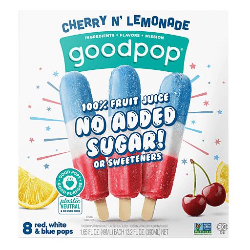 Bring the classic red, white and blue summertime snack home with GoodPop Cherry n' Lemonade ice pops. Made from 100% fruit juice with no added sugar, you can expect explosive fruit flavor with a little lemony zing. Cherry n' Lemonade pops are free of sticky high fructose corn syrup and do not contain any harmful dyes like Red 40. Made for everyone in your family to enjoy. At GoodPop, we're here for those who Crave a World of Good™. The refreshing fruit pops you're about to enjoy create everyday social good via responsible ingredient sourcing, humanitarian efforts and our Pledge Good Foundation. Proudly a Certified B Corp.
