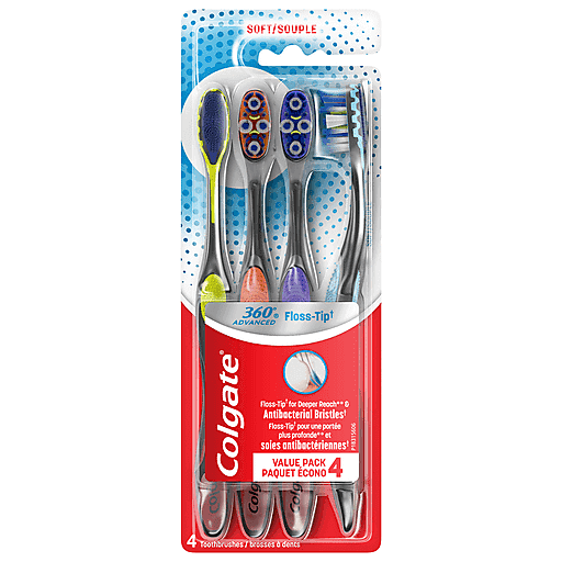 The Colgate 360 Total Advanced Floss Tip* Medium Bristles Toothbrush for Adults 2 pack delivers a unique brushing experience to your oral hygiene routine. Although this medium bristle toothbrush does not replace flossing, it is designed with tapered bristles that are 17 times thinner than ordinary end-rounded bristles. The purple-ended tapered bristles gently reach deep between teeth and along the gumline for a 4X deeper reach, compared to an ordinary, flat trim toothbrush. The medium toothbrush for adults also has a cheek and tongue cleaner that helps remove odor-causing bacteria. Try the Colgate 360 Total Advanced Floss Tip* Medium Bristles Toothbrush for Adults for your brushing needs.