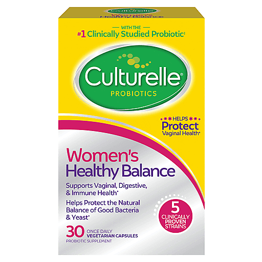 Probiotic Supplement. Dairy, gluten (Meets the FDA's guidelines for gluten-free), soy free. Allergy Friendly: Free from milk, wheat, eggs, tree nuts, peanuts. Not a reduced calorie food. With the no.1 clinically studied probiotic (Based on the number of Lactobacillus rhamnosus GG clinical studies, as of January 2021.). Helps protect vaginal health. Supports vaginal, digestive, & immune health. Helps protect the natural balance of good bacteria & yeast. 5 clinically proven strains. Once daily. Take charge of your unique feminine needs with Culturelle. Support your vaginal & digestive microbiomes with Culturelle Women's Healthy Balance: Formulated by women for women with the only clinically proven blend of 4 lactobacilli most commonly found in healthy women plus the proven effective LGG probiotic stain (Based on the studies of Lactobacillus rhamnosus GG for a range of benefits throughout the lifespan). Beneficial for all women, safe for pregnancy. Supports vaginal digestive & immune health. Helps protect vaginal flora & optimize pH. Helps balance bacteria & yeast. Unleash the Power of Your Microbiome! Your gut microbiome helps support an overall healthy you, because it's linked to your digestive health, cognition, mood, nutrition, & immune system. You can trust your gut daily to Culturelle. Our brand values. We're on a mission to inspire better health & wellness for you & your family. We believe in integrity, so we hold ourselves to the highest standards of truth. We believe in the natural power of your body's microbiome, & in scientific research & products that will unlock its full potential. We believe in uncompromising quality, safety & proven efficacy. We believe in empowering you to embrace every day with confidence. Most clinically researched strain in the world (based on the number of studies of Lactobacillus rhamnosus GG as of January 2019). Guaranteed purity & potency (Guaranteed potency through date on box when store as directed). www.Culturelle.com For questions, concerns or to report an adverse event, please call (800) 722-3476. www.Culturelle.com. (These statements have not been evaluated by the Food and Drug Administration. This product is not intended to diagnose, treat, cure or prevent any disease).