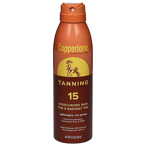 Make the most out of your time in the sun with Coppertone Tanning Sunscreen Spray. This Coppertone spray sunscreen offers Broad Spectrum UVA/UVB protection in a lightweight mist that delivers quick, even coverage and dries in seconds. The non-greasy, hypoallergenic SPF 15 spray sunscreen won't clog pores or cause breakouts. This Coppertone sunscreen spray dries quickly, and is designed to stay on strong when you swim or sweat, protecting you from the sun with a durable and water resistant sunscreen (80 minutes) formula. Each sunscreen Coppertone creates follows a tradition of trusted, quality sun protection products. Coppertone has been providing continuous innovation for more than 75 years, and is voted the most trusted sunscreen brand.* Apply Coppertone Tanning Sunscreen whether you're relaxing during vacation or hanging out in your own backyard. Use and reapply Coppertone sunscreen as directed.