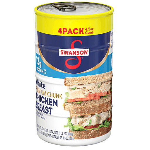Enjoy a delicious shortcut to your favorite chicken dishes with Swanson® White Premium Chunk Canned Chicken Breast in Water. Living up to Swanson’s tradition of simple ingredients, our ready-to-eat, fully cooked chicken chunks contain no antibiotics or added MSG. This premium white chicken meat is 98% fat free, gluten free and an excellent source of protein, with 12 grams in each 4.5-ounce can. Eat it on crackers, add it to salads, or use it in any recipe that calls for diced chicken breast. It’s perfect for making homemade buffalo chicken dip, chicken salad, chicken quesadillas, chicken alfredo and more. Each 4.5-ounce can contains 1 serving of fully cooked chicken breast chunks. Create quick and easy everyday meals and sides with Swanson® White Premium Chunk Chicken in a Can.