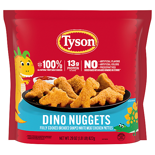 Add some prehistoric fun to the meal with Tyson Frozen Dino Nuggets. These fully cooked and breaded chicken patties take the shape of the epic dinosaurs everyone loves. Made with 100% all-natural* chicken, the dino nuggets are easy to make, dip, and enjoy. The nuggets are crafted with white meat chicken and contain no added hormones or steroids**. Keep the nuggets frozen until ready to prepare, then heat them in an air fryer, oven, or microwave according to the directions on the bag to get warm and crispy dino nuggets with 13g of protein per serving. Whether dunking dinos at school as part of an easy-to-pack lunch or ending the day with a roaring good dinner, these dino nuggets are ready for the adventure. *Minimally processed, no artificial ingredients **Federal regulations prohibit the use of added hormones or steroids in chicken