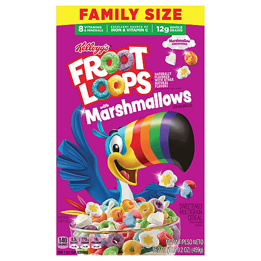 Follow your nose to delicious bursts of fruity flavor in Kellogg's Froot Loops Original with Marshmallows sweetened multi-grain breakfast cereal. Dig into vibrant, colorful crunchy O's made with tasty, natural fruit flavors and fluffy color-changing marshmallows. It's like a rainbow in every bowl! Fun to eat for adults and kids, this low-fat, healthy cereal is a good source of 8 vitamins and minerals per serving; The entire family can enjoy a bowl with milk or a dairy alternative in the morning, afternoon or as a late-night treat. Enjoy sweet cereal milk after a delicious bowl of Froot Loops cereal. Perfect for snacking by the handful at work, as a school snack, in the car, and simply on the go. Always have this sweet cereal handy, add fruity goodness to any lunch box, tote bag, or backpack. Any time you want to include a flavorful pick-me-up in your day, reach for a box of Kellogg's Froot Loops cereal.