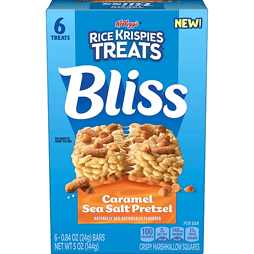 Take a bite of sweet, salty, crispy perfection. Enjoy timeless Rice Krispies Treats snacks now topped with candied sea salt pretzels and layered with caramel-flavored chips. You’ll love the delicious indulgence in Rice Krispies Treats Bliss Caramel Sea Salt Pretzel bars. They’re mouthwatering snacks perfect for both kids and adults with crunchy and chewy in perfect balance. From the tasty toppings to the layer of creamy caramel-flavored coating on the bottom, treasure every craveable bite when you need a just-for-you moment; It’s a 100 calorie bar made with no high fructose corn syrup, perfect for a lunch snack. These individually wrapped on the go snacks make it easy to satisfy cravings at work or whenever you need a decadent escape. Long day? Kick back and relax with an indulgent marshmallowy cereal bar. Enjoy as an afternoon snack, treat yourself to dessert, or share crispy, sweet and salty perfection as a party snack with friends. Pack your pantry with grab and go sweet snacks for hit-the-spot deliciousness. Savor the flavor and crunch of this sensational take on a classic treat.