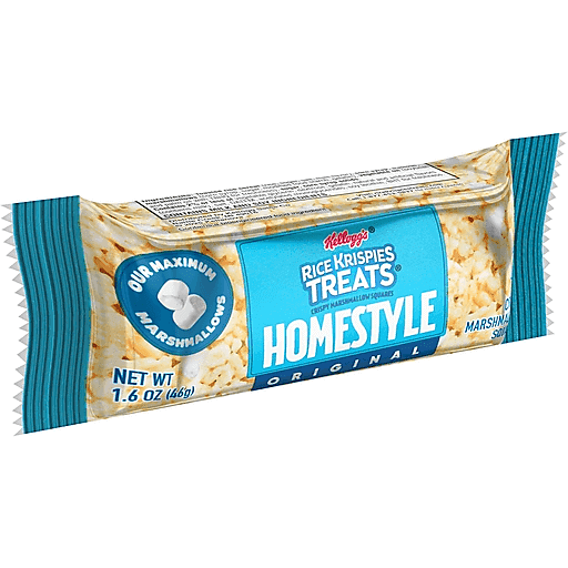 Discover a delicious take on a classic, Rice Krispies Treats Homestyle Original crispy marshmallow squares. We've taken puffed rice cereal and extra marshmallows to craft our thickest, gooiest homestyle recipe. Every 33g bar is 50% bigger than our Original 22g bar and packed with pockets of melted marshmallows from top to bottom; The result is in our thickest, gooiest homestyle treat that the whole family can enjoy. Each package contains one individually wrapped marshmallow bar that's perfect for snacks at school, the office, car rides, lunchtime, TV time, and more. Take this deliciously convenient, ready-to-eat treat wherever you and your family travel. The ooey-gooey goodness in each bite delivers the perfect sweetness that's delicious any time of day. Pull apart the bar and reveal the fluffy marshmallows that'll keep you coming back for more. Unwrap the simple goodness of Rice Krispies Treats Homestyle Original and feed your sweet cravings day or night.