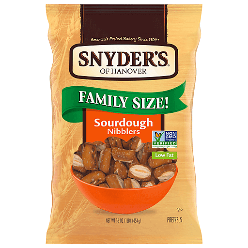 With Snyder's of Hanover Sourdough Pretzel Nibblers, you can enjoy the great taste of aged sourdough in a crunchy, bite-sized shape. Everyone can enjoy this Non-GMO Project Verified snack, which is made in a facility that does not process peanuts. That makes them ideal for school, lunches, sports and on the go. Or pair this fat-free snack with hummus, cheese spreads, dips, or enjoy them right out of the bag. Snyder's of Hanover has been America's Pretzel Bakery since 1909 and our pretzels give you that delicious crunch for the perfect snack! Snyder's of Hanover pretzels are kneaded and oven-baked to seal in all the flavor. Snyder's of Hanover pretzels have been shared across tables, across generations and across the country, making us America's favorite pretzel brand. This 16-ounce Family Size Bag of Snyder's Sourdough Pretzel Nibblers has plenty for sharing with friends and family. Feed all your cravings with Snyder’s pretzel snacks.