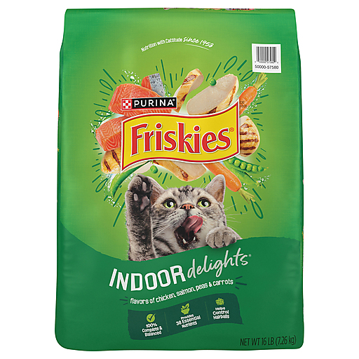 Help your cats maintain their purrfect physique with Purina Friskies Dry Cat Food Indoor Delights Flavors of Chicken, Salmon, Peas, and Carrots. This a-MEOW-zing formula provides 100 percent complete and balanced nutrition for adult cats, promoting healthy weight and helping control hairballs for your indoor cats. This cat kibble specifically provides essential fatty acids for skin and coat health, vitamin A and taurine for vision support, and antioxidants for cats’ immune support. If you are still looking to give your indoor cats something more to explore, this Friskies cat food features cat-tastic shapes to capture their attention and imagination. Make this delicious indoor cat food part of your cats’ mealtime, feed their taste for adventure, and they will meow for more. Purina Friskies Dry Cat Food Indoor Delights Flavors of Chicken, Salmon, Peas, and Carrots has it all.