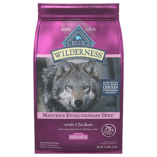 Premium, high-protein BLUE Wilderness is the protein-rich food your small breed dog was born to love. Created to satisfy ancestral cravings, it starts with delicious chicken and contains wholesome grains for truly balanced nutrition. Formulated specifically for small breed dogs, this food contains high-quality deboned chicken, plus chicken meal and dried chicken to support the development of healthy muscles.